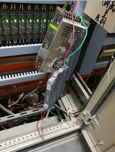 在调试过程中存在如下问题:由于厂区内的DCS板卡均不具备配电功能,于是现场提出用24V直流电串联信号线给雷达料位计供电的办法(雷达料位计为两线制仪表),供电后,雷达料位计显示正常,与人工量库测算结果相当。仪表显示屏上也有准确显示,但始终测量不到输出电流,DCS也接收不到信号。由于现场的隔离器均为国产的普通四线制隔离器或无缘隔离器,起不到对料位计配电的作用,在无源隔离器上串入电源,也始终无输出。最终解决方案是采用了TOKAN的TBDY隔离配电器,最终显示正常,测量稳定。调试过程中图片如下所示: